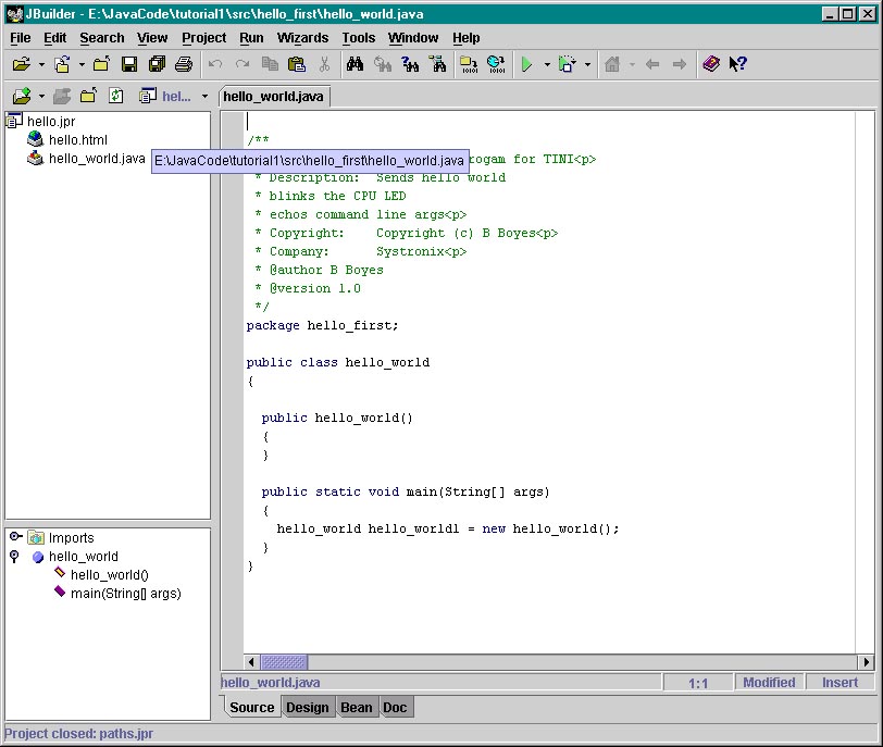 Now we have our project file and class template. We need to add some common TINI packages so that we can use their classes. Do that using 'import'. Add these lines of code below our 'package' statement but before our class definition. import com.dalsemi.comm.*; Also we need to add something for the program to do. To make it a little more interesting, we'll add the action as part of our new class: // our default constructor // a method we are adding And we need to invoke this method from within the main() method of our class, so add this code below the instantiation of hello_world: hello_world hello_world1 = new hello_world(); try Now we're ready to build. In the main JBuilder toolbar, click Project->Make project. If you have no typos you'll see a "Build Succeeded" message at the bottom of the JBuilder frame. Here's a link to the complete hello_world.java file in case you want a copy of the source code as it exists on my PC. |