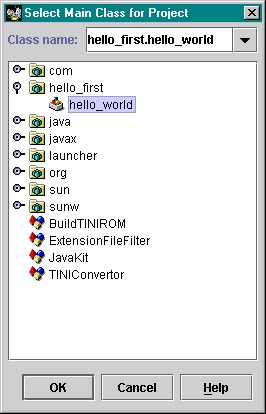 So far we haven't used anything unique to TINI in our hello_world class, so we should be able to execute it on the PC. This is one of Java's nice features. Within limits, you can run the same code on any Java-enabled platform. Let's try it. On the main JBuilder toolbar, click Run, and a 'runtime properties' dialog will open. JBuilder wants to know what we want to run (it won't make the obvious assumption that since our project has only one class it might be that class...). |