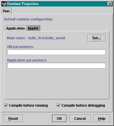 | We need to set the main class, so click the SET button and browse to our hello_world class, then click OK. For now we won't set any VM or application parameters. (Application parameters command line arguments whihc you can pass to your application.) |