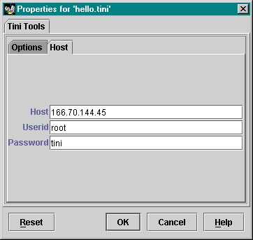 In the Host tab, set your TINI's IP address, click OK. Note: this IP address is the public TINI here at Systronix. If you don't have a TINI of your own yet and are desperate to try one, go ahead and access ours. Otherwise, be sure you enter your TINI IP address, not ours! If several people try to use our TINI for the tutorial at the same time, I'm not sure what may happen... |