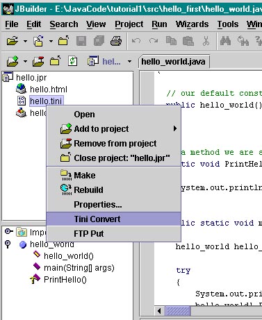 | Now JBuilder's project pane should show a file "hello.tini" added to our project. |
