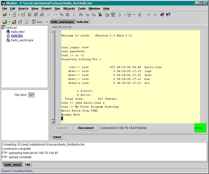 Since we turned off the TiniTools automatic telnet connection and login, we need to do that manually. Double click on the hello.tini file in the JBuilder project pane. A new "hello.tini" tab should be created in the JBuilder source pane. This is the window into the telnet connection between JBuilder and your TINI. Click on the Connect button. You may need to hit the enter key and/or resize your telnet pane to see the TINI login prompt. You should see the RX and TX lights on your tini flash briefly with every keystroke while your telnet connection is active. You're connected to "slush", the TINI command shell. You will be logged into TINI's root folder. Type "ls -l" for a detailed listing. You should see hello.tini in the root folder. Note: these screen captures were taken using the Systronix public TINI system which has other files installed and was also running TiniHttpServer. |