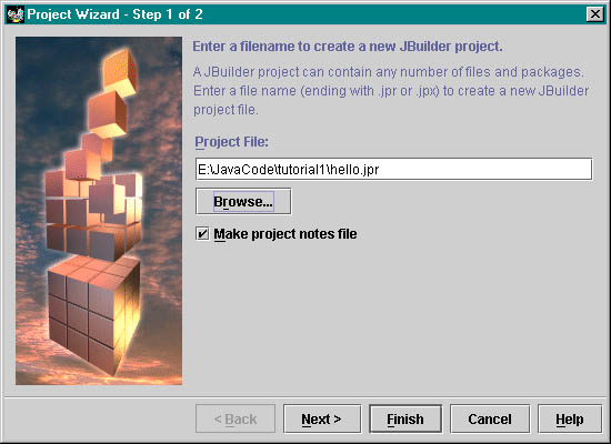 | Create a new project (File->New Project), a new project wizard will open. Browse to the JavaCode folder you created earlier, type in a subfolder tutorial1 and call the project "hello.jpr". |