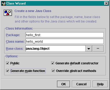 | Click 'next', fill in any additional information you desire and then click 'finish'. Now we need a new class. Use the JBuilder File->New Class pulldown and the class wizard will open. Call the package hello_first, the class hello_world, and check all the options. Click OK. |