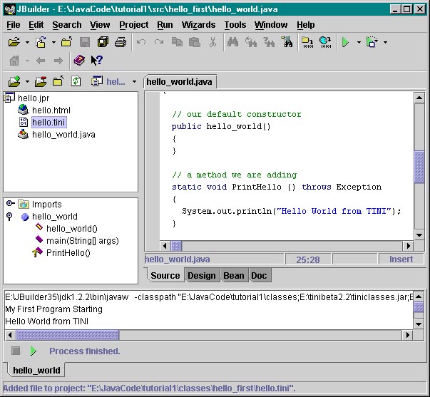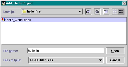 | Now JBuilder's project pane should show a file "hello.tini" added to our project. |