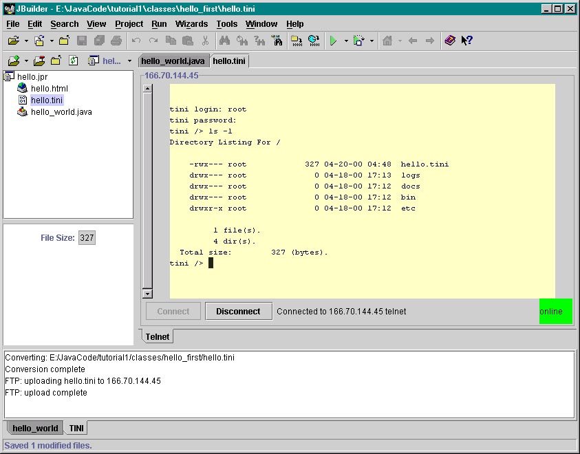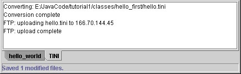 | You should see a message (JBuilder View->Messages must be checked) in a new "TINI" tab in the messsage pane at the bottom of the JBuilder window. |