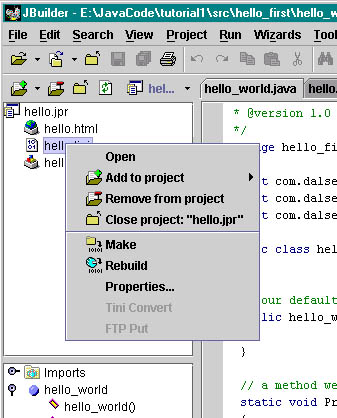| Now JBuilder's left pane shows a new project, hello.jpr, with our hello_world.java class. If you move the cursor over the filenames in the project pane a balloon will appear and you can see that the .java file is located in a package folder which is a /src subfolder, as we saw in the previous file paths examples. |