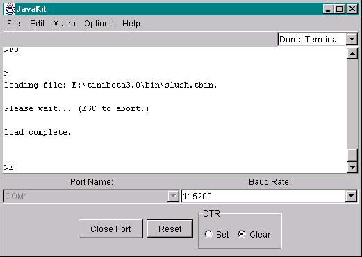 Now from the JavaKit file menu, select Load File and browse to (in my case) e:\tinibeta3.0\ bin\tini.tbin Note that JavaKit now has a progress indicator just below the main menus. Also, note that you no longer need to manually clear out flash banks like you did in Beta 2.2 and prior. JavaKit and the new loader now do this automatically. Very nice. Tini.tbin is a binary file, hence about 2.5X smaller than an equivalent HEX file, so that much faster to load. |