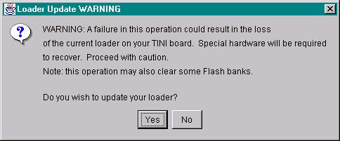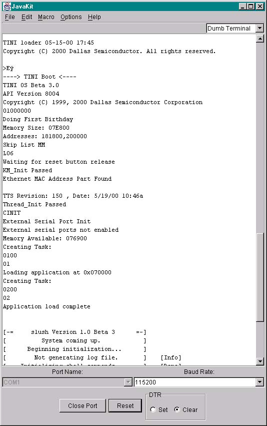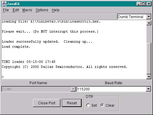 | Click OK. JavaKit will automatically reset TINI for you, and you should see the new loader prompt with a date of 05-15-00. |