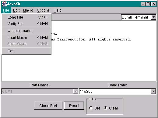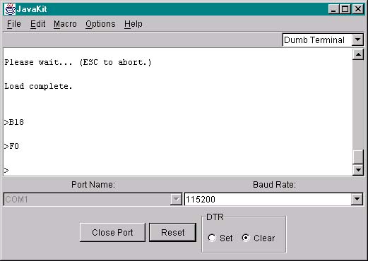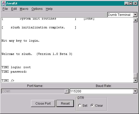 Print out the readme.txt file which came in the TINI .tar archive, and follow along with it as you follow along with me. Yep - I did exactly that (a rare case of practicing what I preach.) I'll hit the high points and areas in which my approach differs from the readme file. I have e:\tinibeta2.2 already in my system and I don't want to accidentally refer to any beta 2.2 files. I don't want to delete all the beta 2.2 files, not yet, anyway. So to prevent problems and make it obvious when I accidentally refer to the old beta 2.2 folder, I changed its name to e:\tinibeta2.2.obsolete. I wrote a batch file to execute JavaKit - it's just my preference. The batch file contains one line (it wraps to two lines in this tutorial text box). I call it JavaKit.bat and it's located in e:\tinibeta3.0. Also here's a link to the file JavaKit.bat E:\JBuilder35\jdk1.2.2\bin\java -classpath E:\JBuilder35\jdk1.2.2\lib\comm.jar;E:\tinibeta3.0\bin\tini.jar; JavaKit Note: I'm using a Systronix STEP board with the DTR reset jumper installed. Our TILT boards have a similar jumper. This is necessary to enable JavaKit to invoke TINI's loader. If you are using the Dallas SocketPlus board, Rev A, you must have a solder blob on jumper J1, labeled DTR Reset. OK, I click on the batch file and here's JavaKit. Select COM1 (that's my COM port to TINI), click the Open Port button, then Reset, and I get the loader prompt from TINI: |