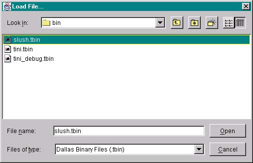 | Still at a TINI loader prompt, use the File Load File menu and browse to bin\slush.tbin, and click Open to send the file to TINI. |