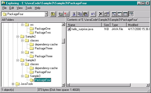 | Save and build the new project and see what we have in Explorer. Whoa what? JBuilder created a second /Sample3 folder and put our source there, not in a /src folder. There's a little bit of logic to this since we DID set the source path to d:/JavaCode/Sample3, but that's not what we got - the source is now in d:/JavaCode/Sample3/Sample3?? Oh well... |