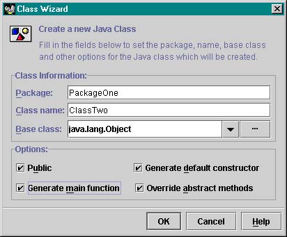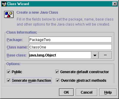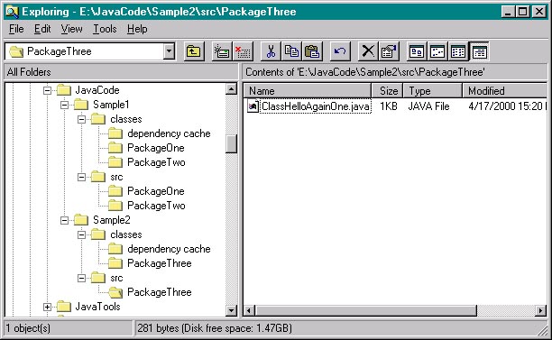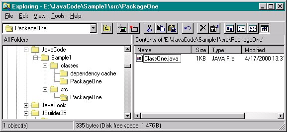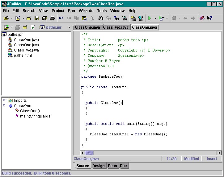 No default paths, manually typed prj pathI created a folder e:/JavaCode/ with the intent of subfolders for each sample program, i.e., e:/JavaCode/Sample1, e:/JavaCode/Sample2, etc. There was no default project source path. At the JB New Project Wizard, I manually typed in the path, even though the folders did not exist at the time. JBuilder went ahead and created the folders (without asking for acknowledgement, as most windows apps would). Paths.jpr got created in the JavaCode/Sample1 folder as hoped. Now I created a new class 'ClassOne' in package 'PackageOne'. Interestingly, JBuilder created subfolders "src" and "classes" for the project source and output folders, respectively. |