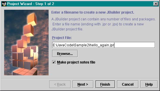 | One more thing to test is adding another new project in the same main JavaCode folder, browsing to it in the new project wizard. Close the current projec and start a new one. All I can browse to is the JavaCode folder, and then type in the new project folder - Sample2 - and the project name which I will call "hello_again.jpr" |